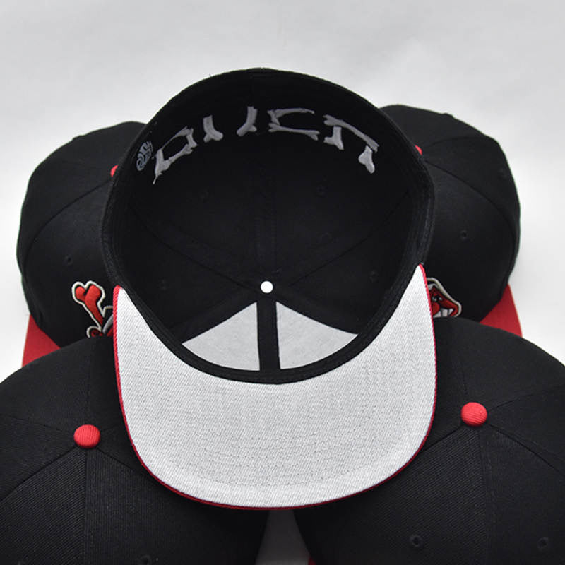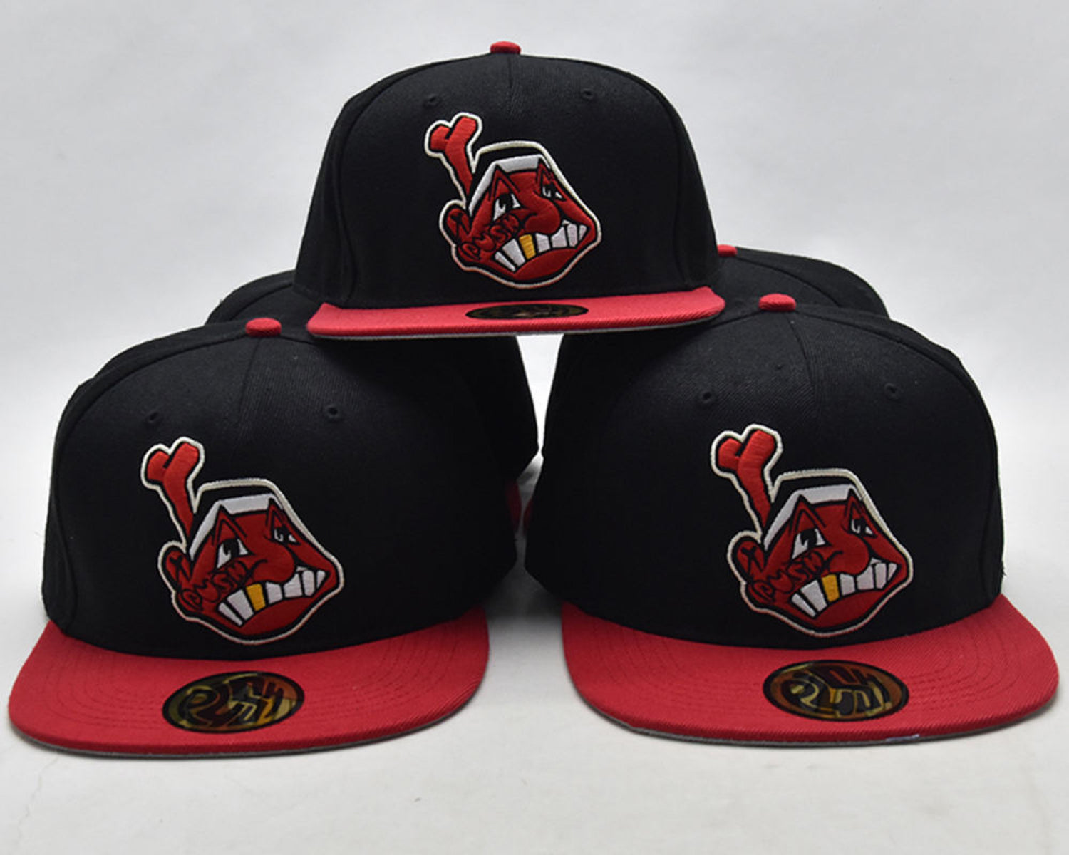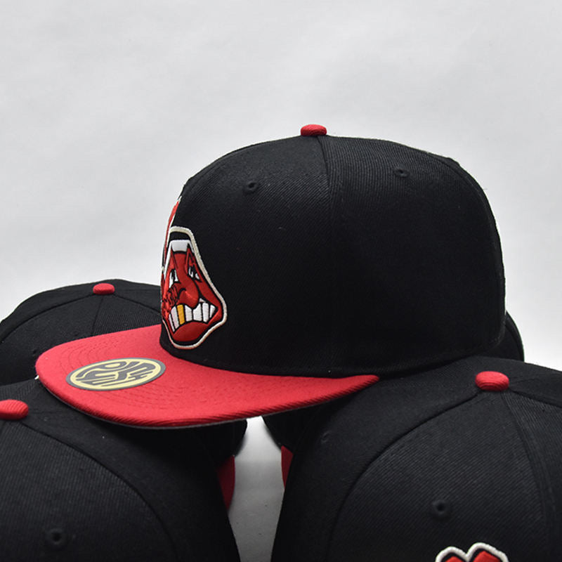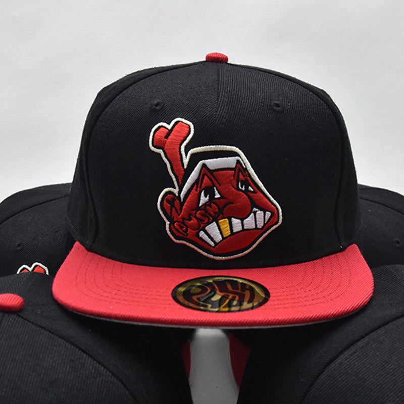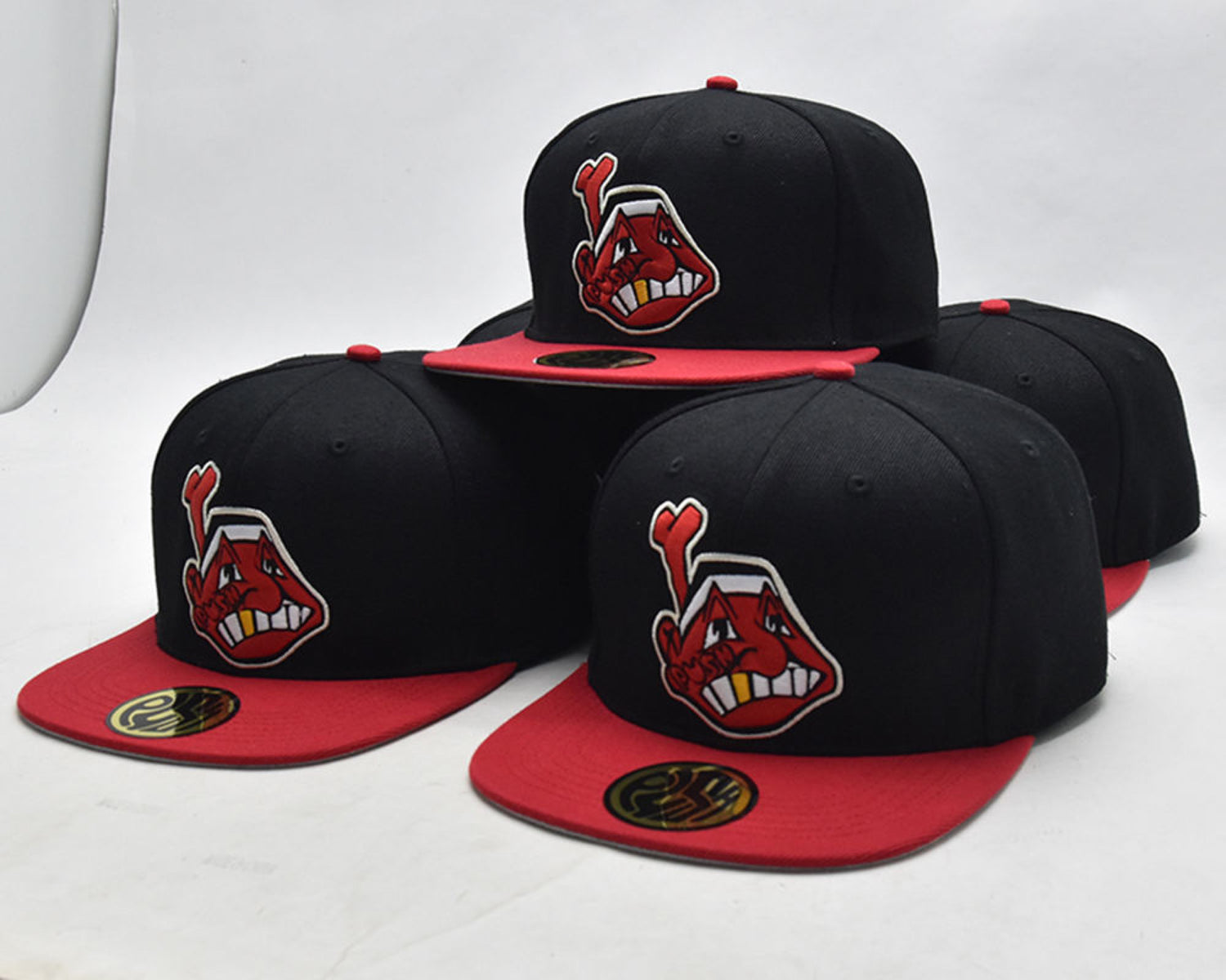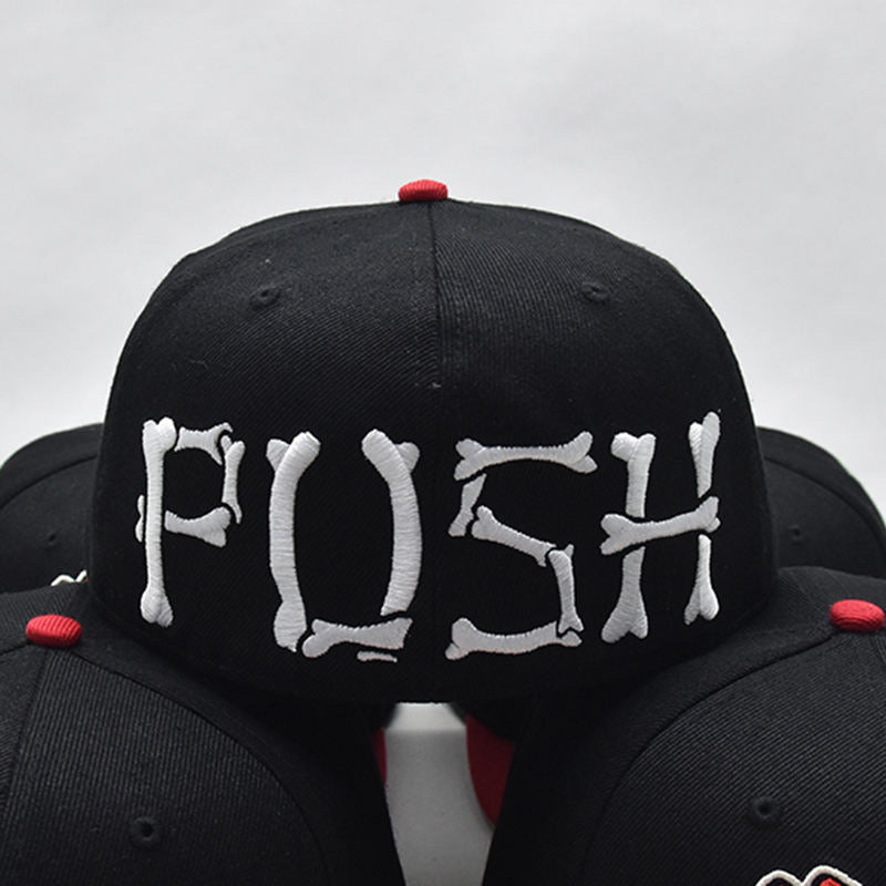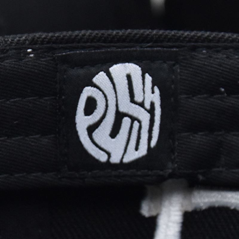 A black fitted with red brim and custom 'P.U.S.H' and 'REVERSE CLEVELAND' embroidered patches surrounding. Includes gold sticker on top brim and stitched tag inside of hat.
